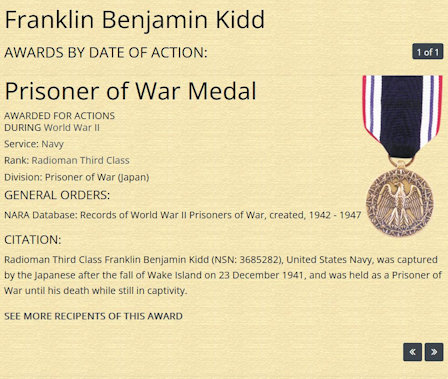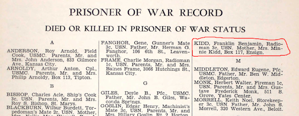 He joined the Navy and was trained as a Radioman (Service Number: 3685282). On Nov. 20, 1941 he boarded the U.S.S. Wright in Pearl Harbor for transport to Wake Island. He was captured by Japanese forces following the fall of Wake Island on December 23, 1941, and subsequently held as a prisoner of war. Kidd was imprisoned at the Tokyo POW Camp (Shinjuku) in the Tokyo Bay area. He died in captivity on October 22, 1944, reportedly due to stomach and lung infections.