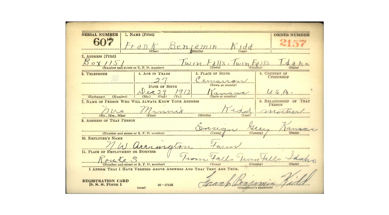 Franklin Benjamin Kidd was born on December 29, 1912, in Cimarron, Kansas, to Minnie Grace Payton, and Benjamin Franklin Kidd. The family lived in Ensign and Franklin attended Ensign schools. By 1940, Franklin moved to Twin Falls, Idaho.